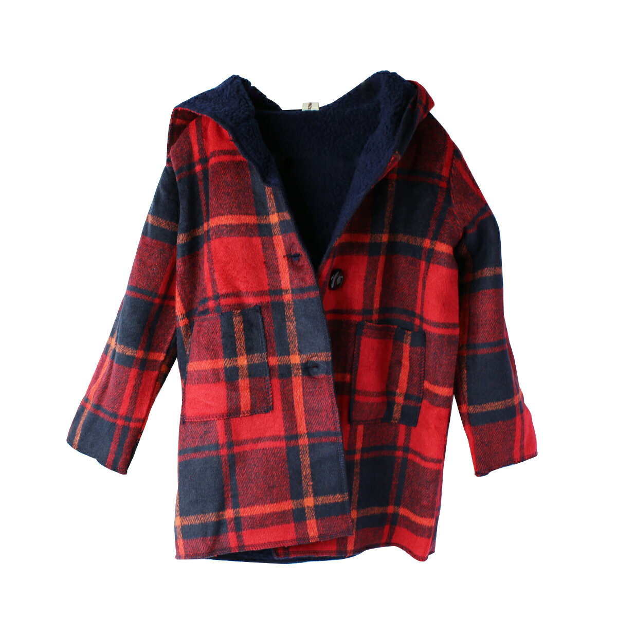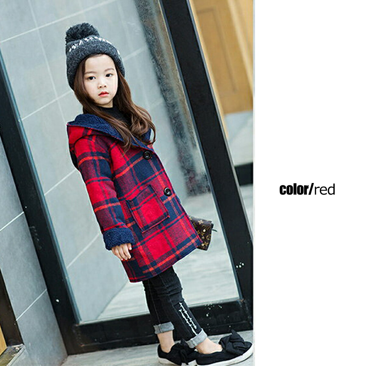 【子供服yuai】 ◇フード付き 裏ボア チェック コート サイズ:110cm〜150cm 色:レッド・グリーン ※韓国サイズになりますので、日本製のものより細身になります。